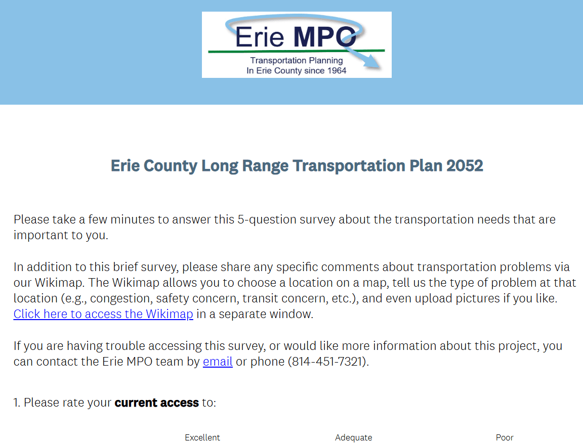 - Answer our public survey at https://www.surveymonkey.com/r/erielrtp2052. This quick 5-question survey requests input on residents’ access to services, and thoughts on transportation priorities and goals.