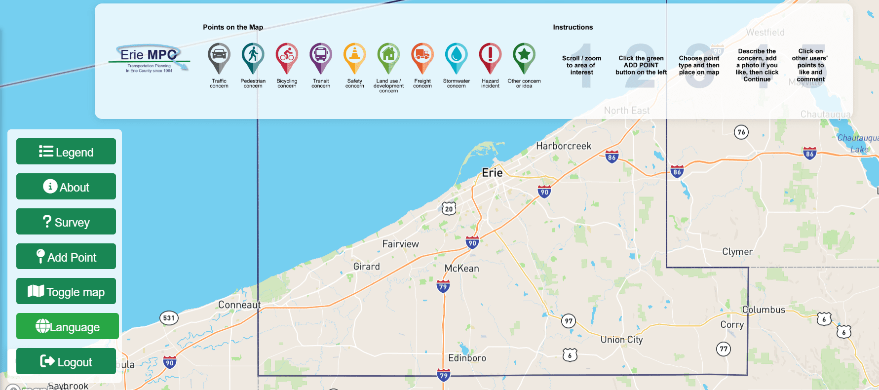 In April 2025, Erie MPO launched its LRTP Update 2052 planning effort, which is expected to be completed by the end of 2026. The first step in the planning process is to gather input from the public about their transportation issues and concerns in the county.